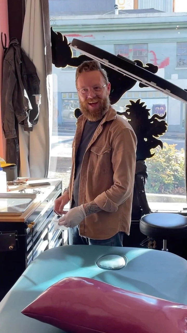 Patrick Egan from Pink Panther Tattoo PDX inking a happy hour tattoo in Portland, Oregon